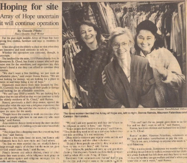 Come by and visit us here at Array of Hope Ramos Ministries, hear our heart and our passion, and find out what and where the needs are for volunteerism. We have many needs, from janitorial and organizing of all kinds to creativity opportunities and hanging clothes to ministering to our many clients through assistance, prayer, love, and kindness. Many of our clients are elderly and are very lonely; come in and take time to talk with them, value them, and show them how valued they truly are. When the Bethlehem restaurant is up and running, we will be looking for servers, cooks, prep workers, ministers, and praise and worship leaders during meals.We have too many outreach opportunities to mention. We also supply the area churches with clothing that they will need for their mission outreaches in other countries; we provide high-quality clothing freely as requested by the mission outreach of every and any church.